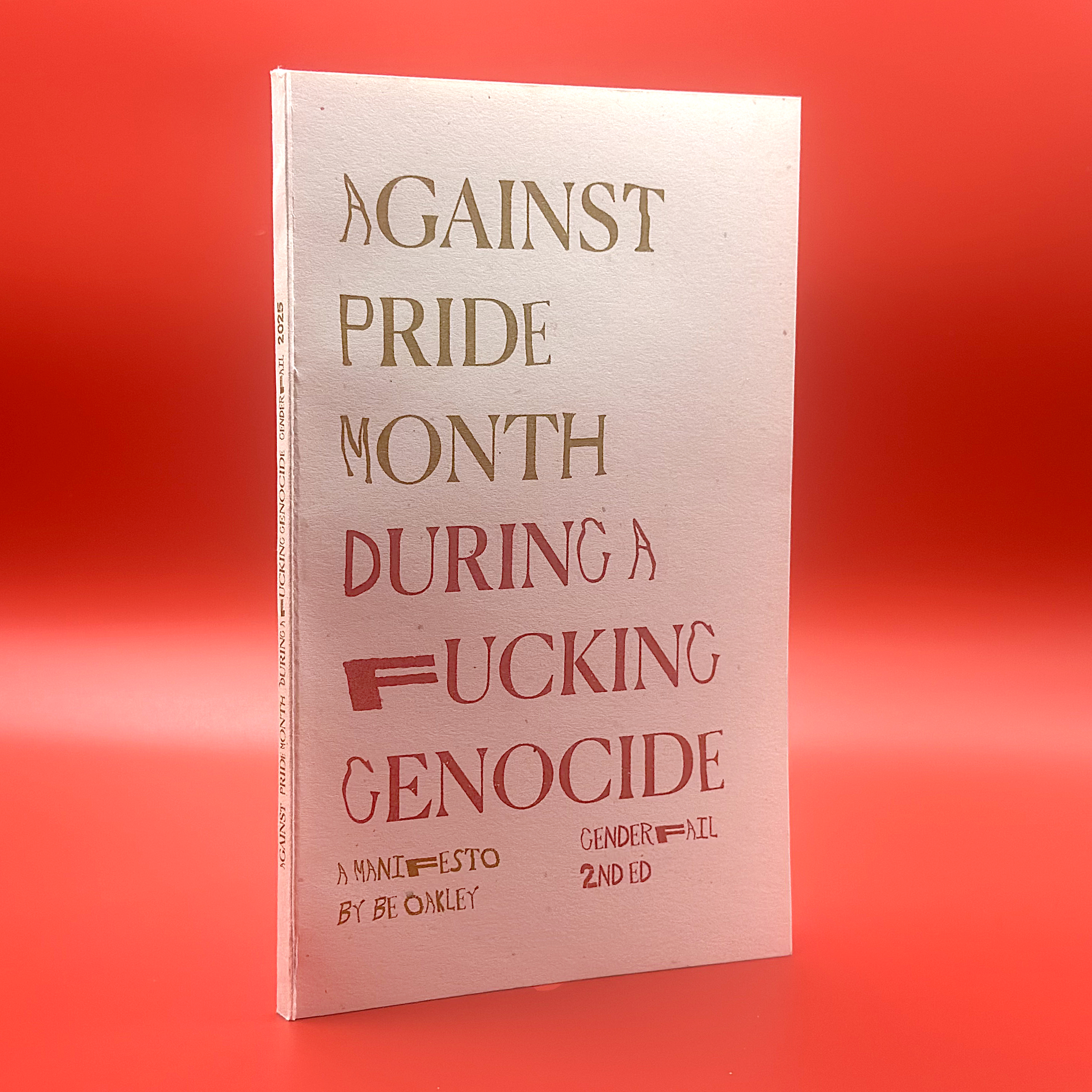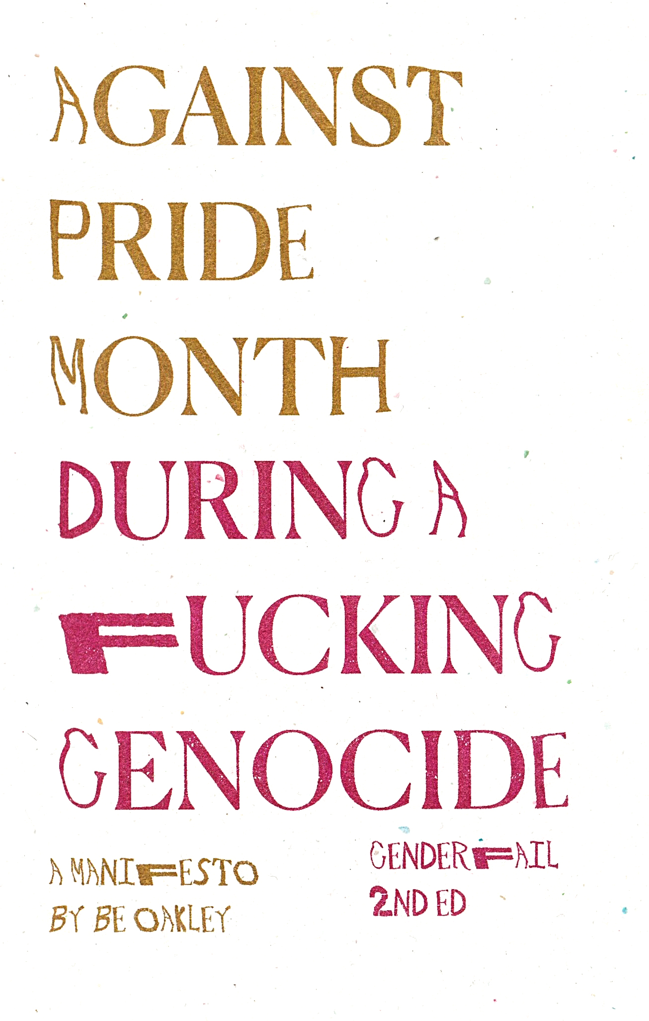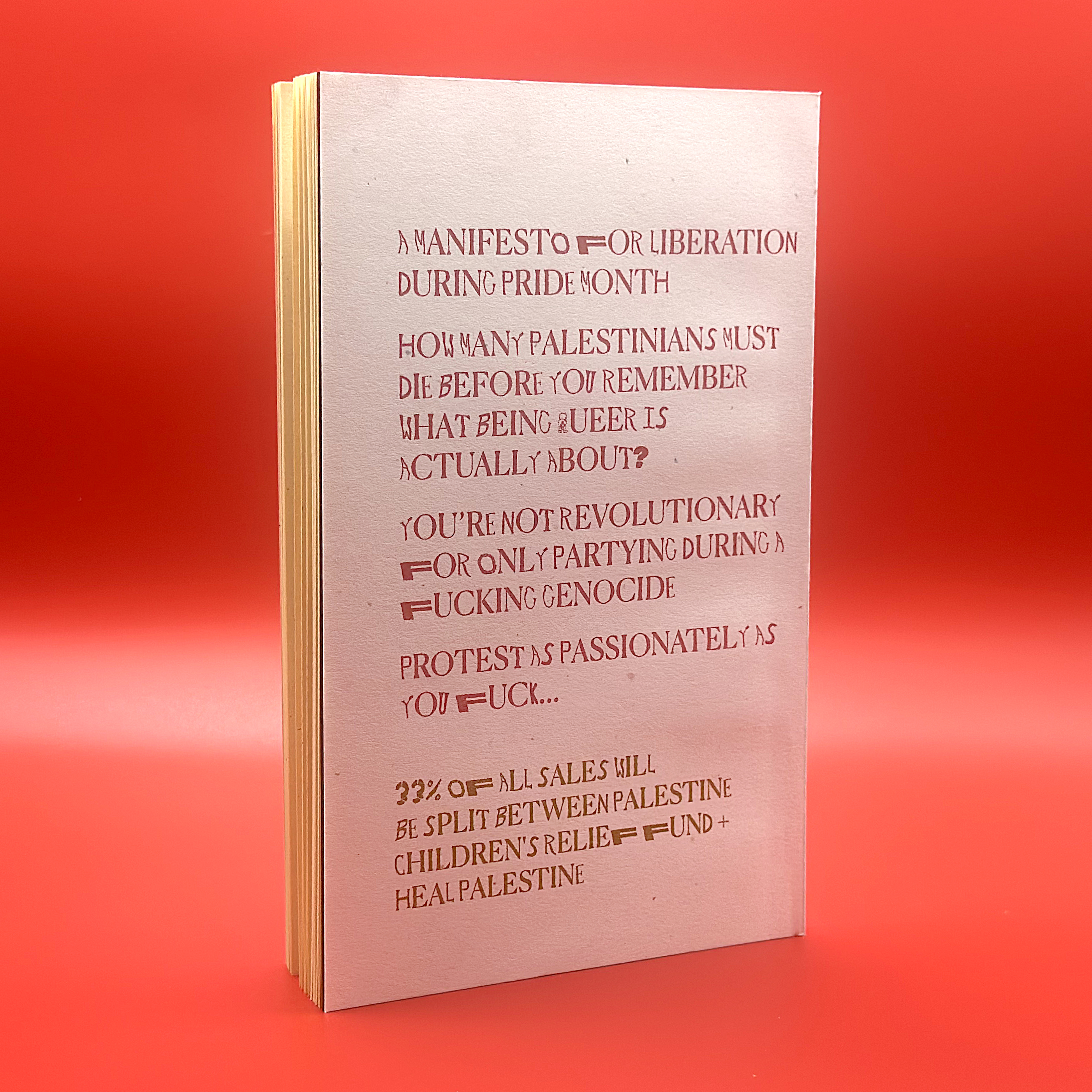 AGAINST PRIDE MONTH DURING A FUCKING GENOCIDE MANIFESTO is a urgent text asking all queer + trans + non-binary people during pride month to protest more than we party to be in solidarity with Palestinians. This manifesto will be messy, imperfect, but hopefully deeply human in its attempt to inspire you to live up to the ideals that Pride Month originally stood for: a riot against injustice.