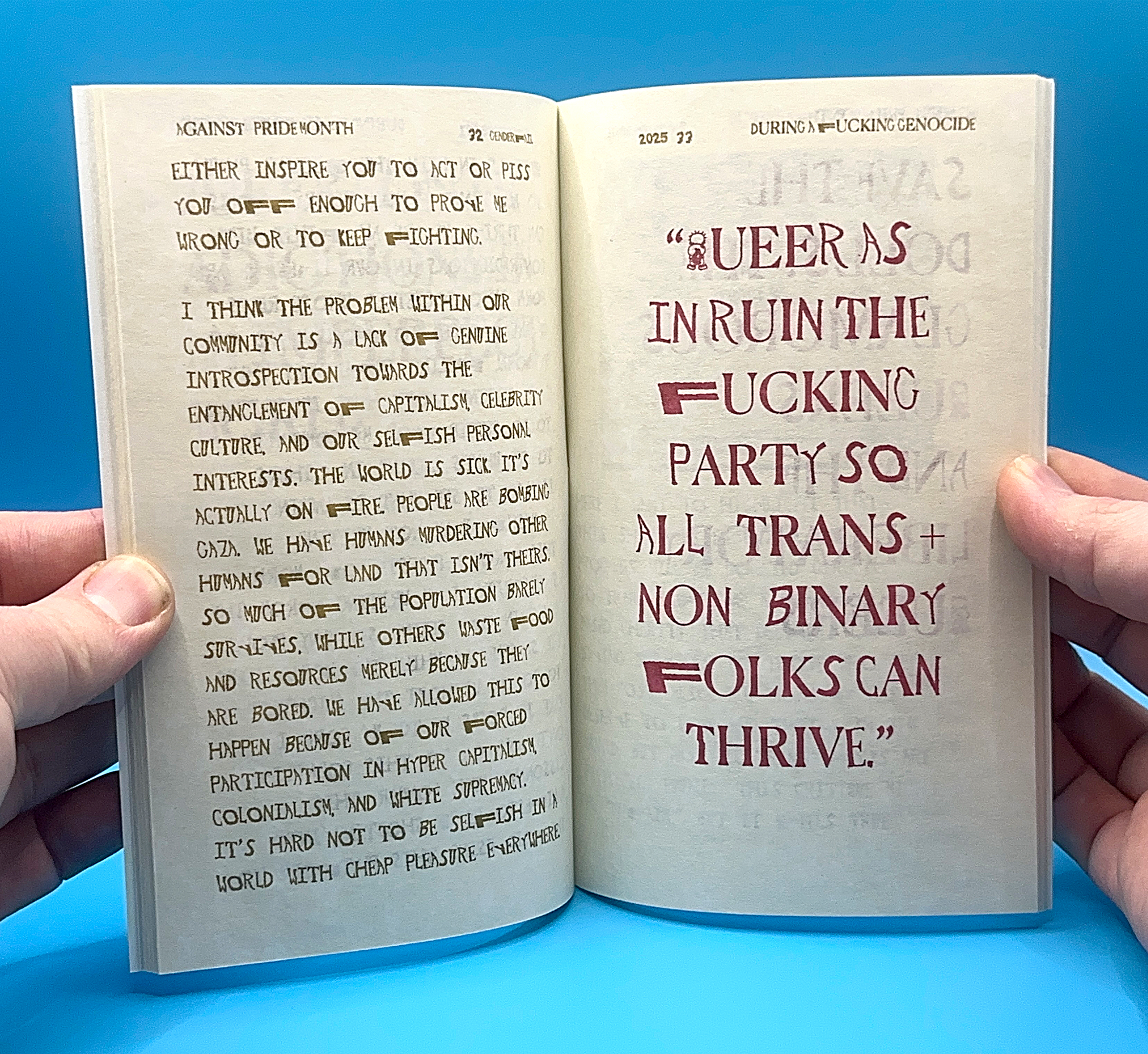 This text was produced urgently to highlight the importance of inspiring fellow queer individuals to take action this Pride Month. In just one week, this text was written, designed, and published, showing the urgency of getting this information. As a disabled person, publishing is fundamental to how I protest.