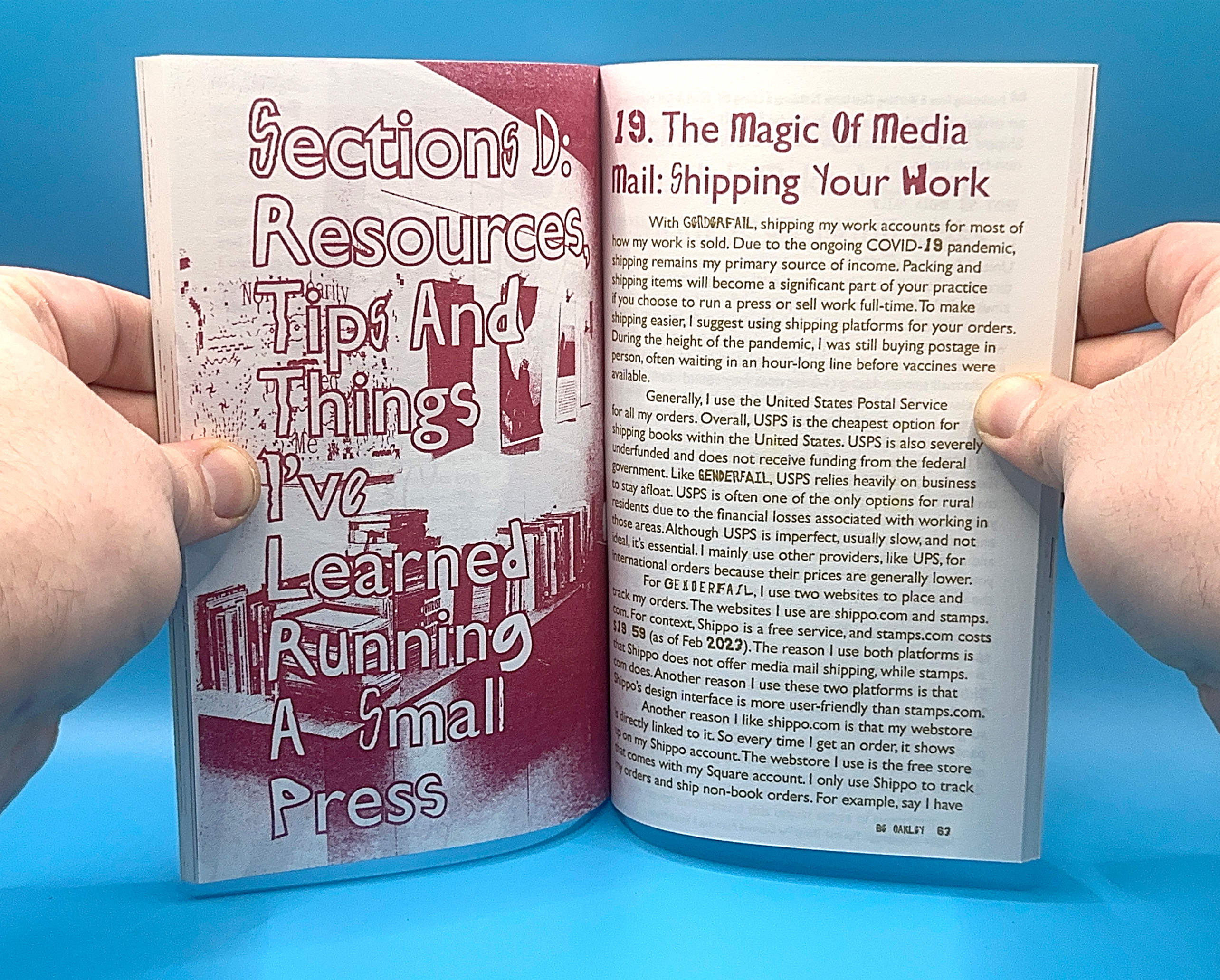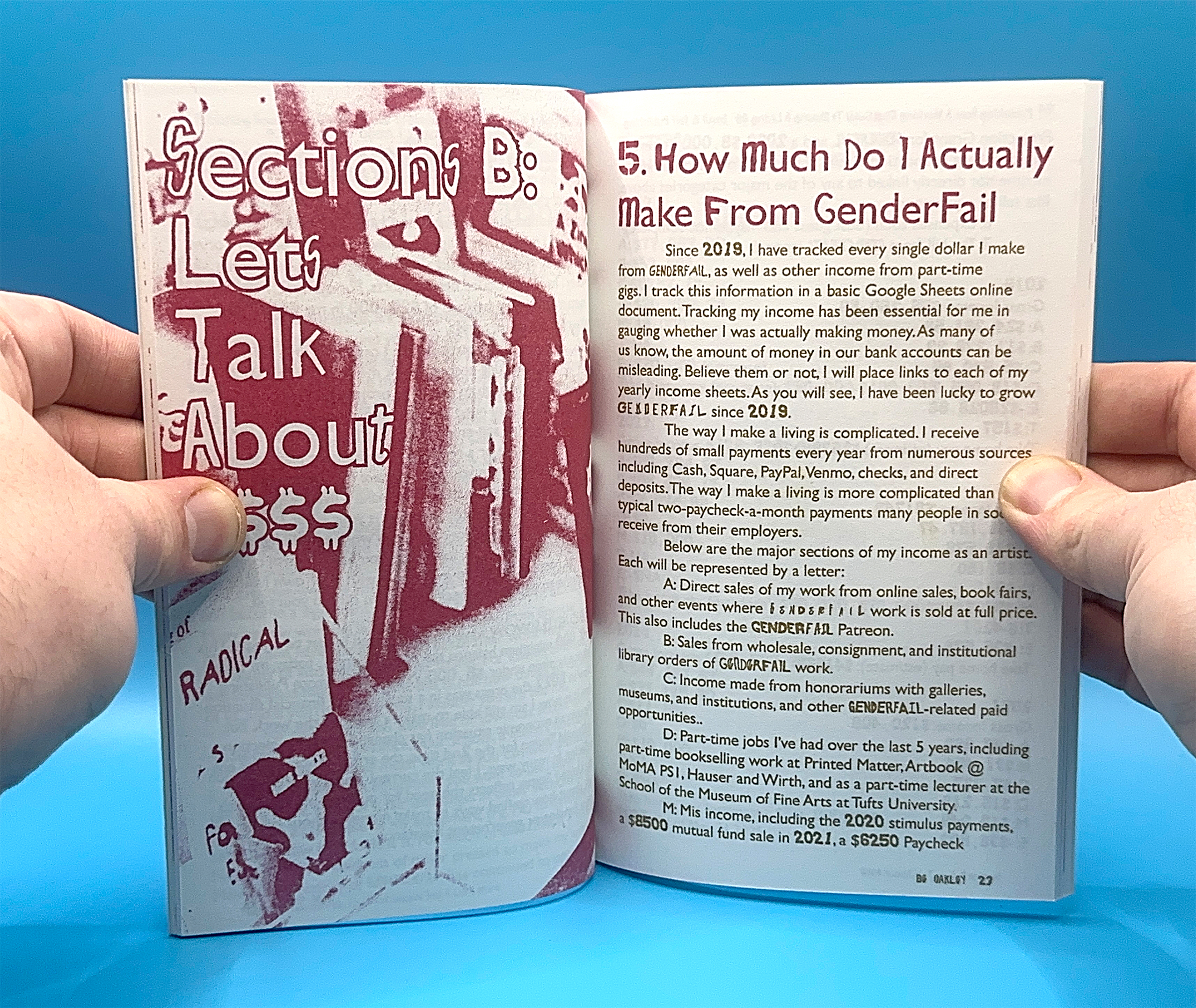 With GenderFail, I didn’t have any funding when I started, and over the 10 years of the project, I have found a way to do the work I want while also paying my bills. Publishing now: A Working Class Guide to Making a Living Off Small and Self-Publishing is my attempt to offer honest advice, true stories, resources, and other information that can help low-income and working-class people find ways to make a living as artists. This book also acts as a crystallization of my interests and goals as an educator. The title, in part, Publishing Now, is taken from a class I taught for 4 semesters at SMFA at Tufts University. In this, I wanted to give an honest survey and account from the perspective of a working-class artist and publisher. In many ways, this book is the core of what that class intended to share.