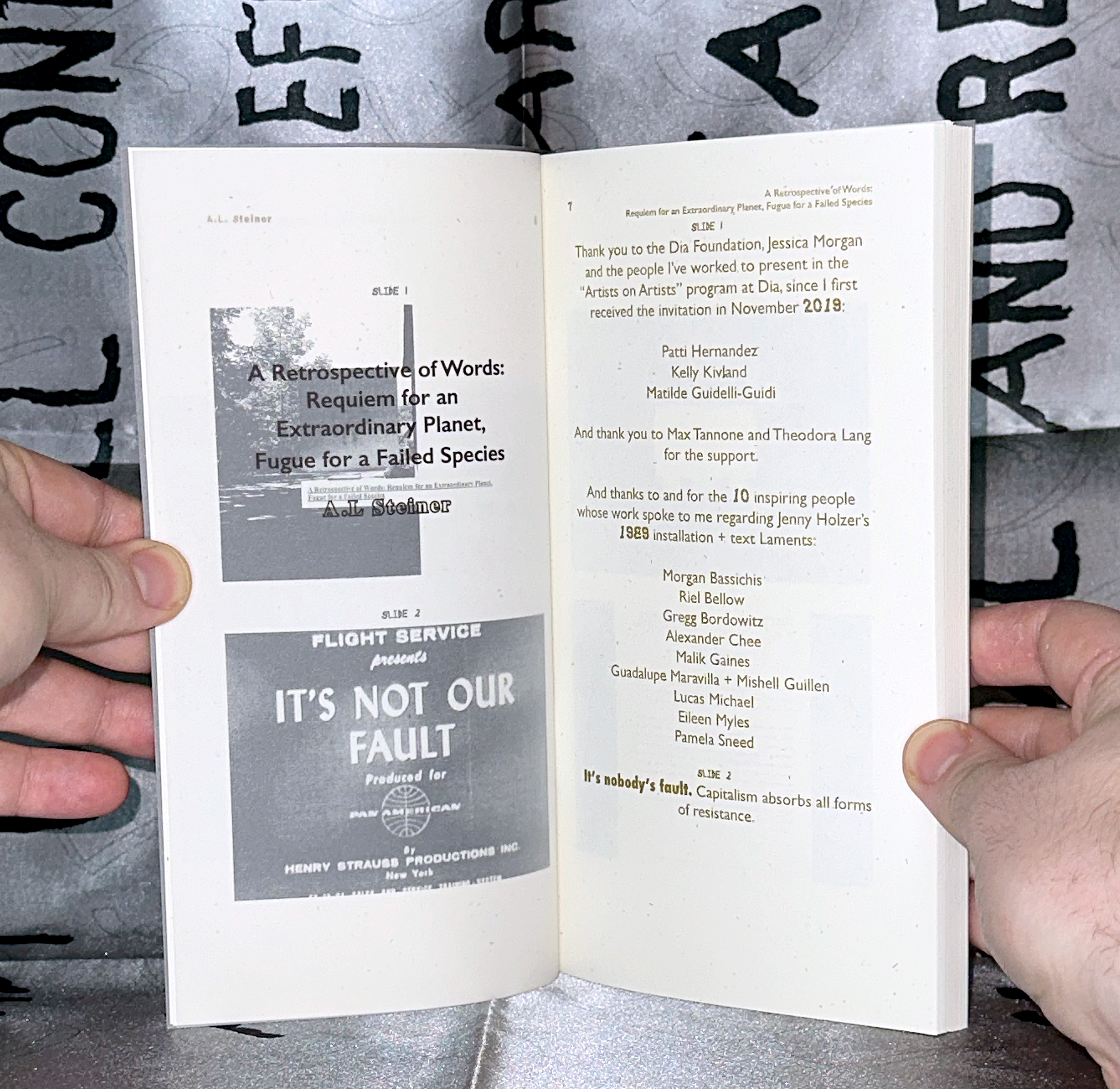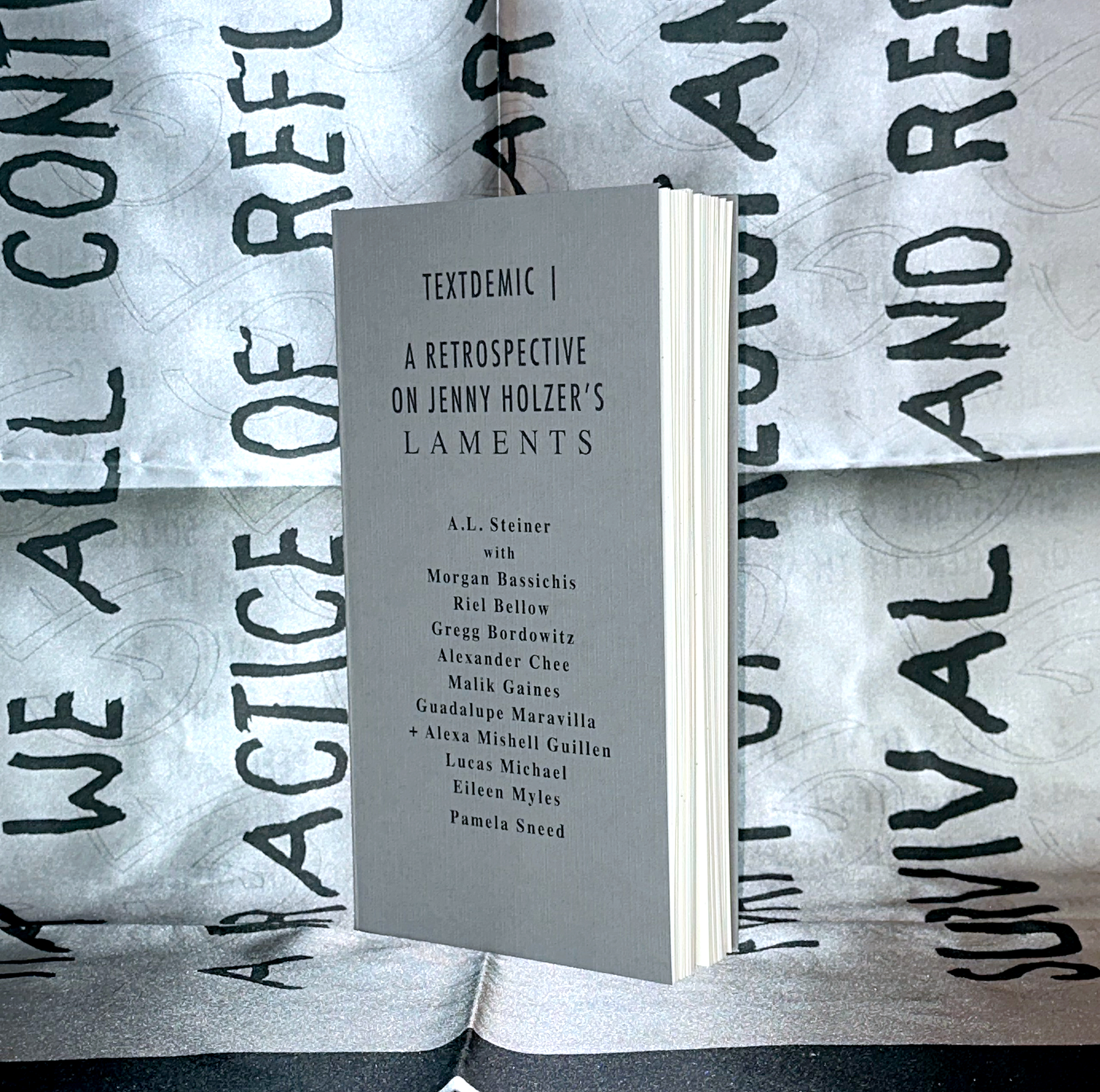 Textdemic | A Retrospective on Jenny Holzer’s Laments” Ed. by A.L. Steiner and GenderFail, a publication based on A.L. Steiner + Friends on Jenny Holzer at Dia Chelsea. This book is based on the Artists on Artists Lecture Series when the Dia Art Foundation invited Steiner to curate a public program based on a work of the artist's choice.